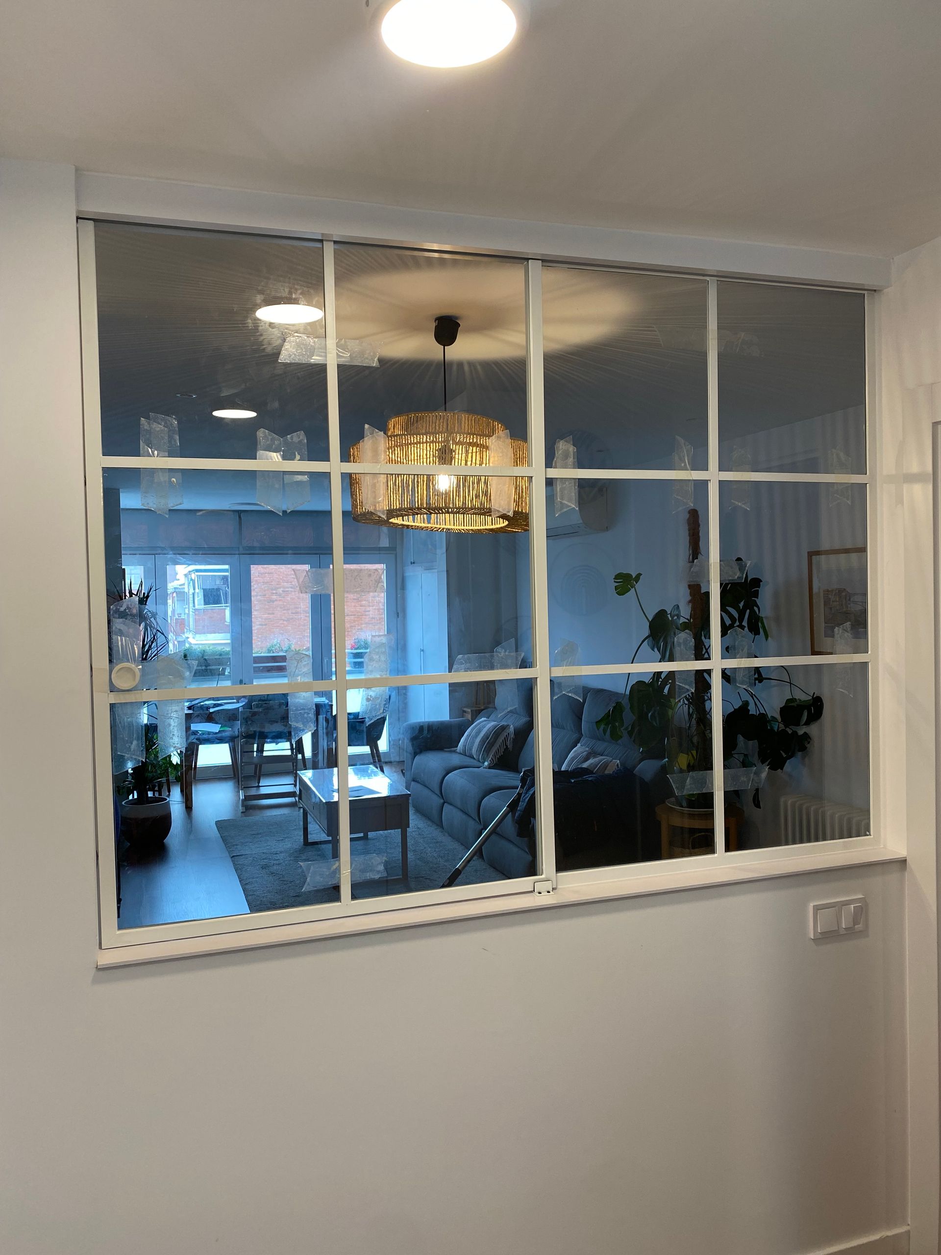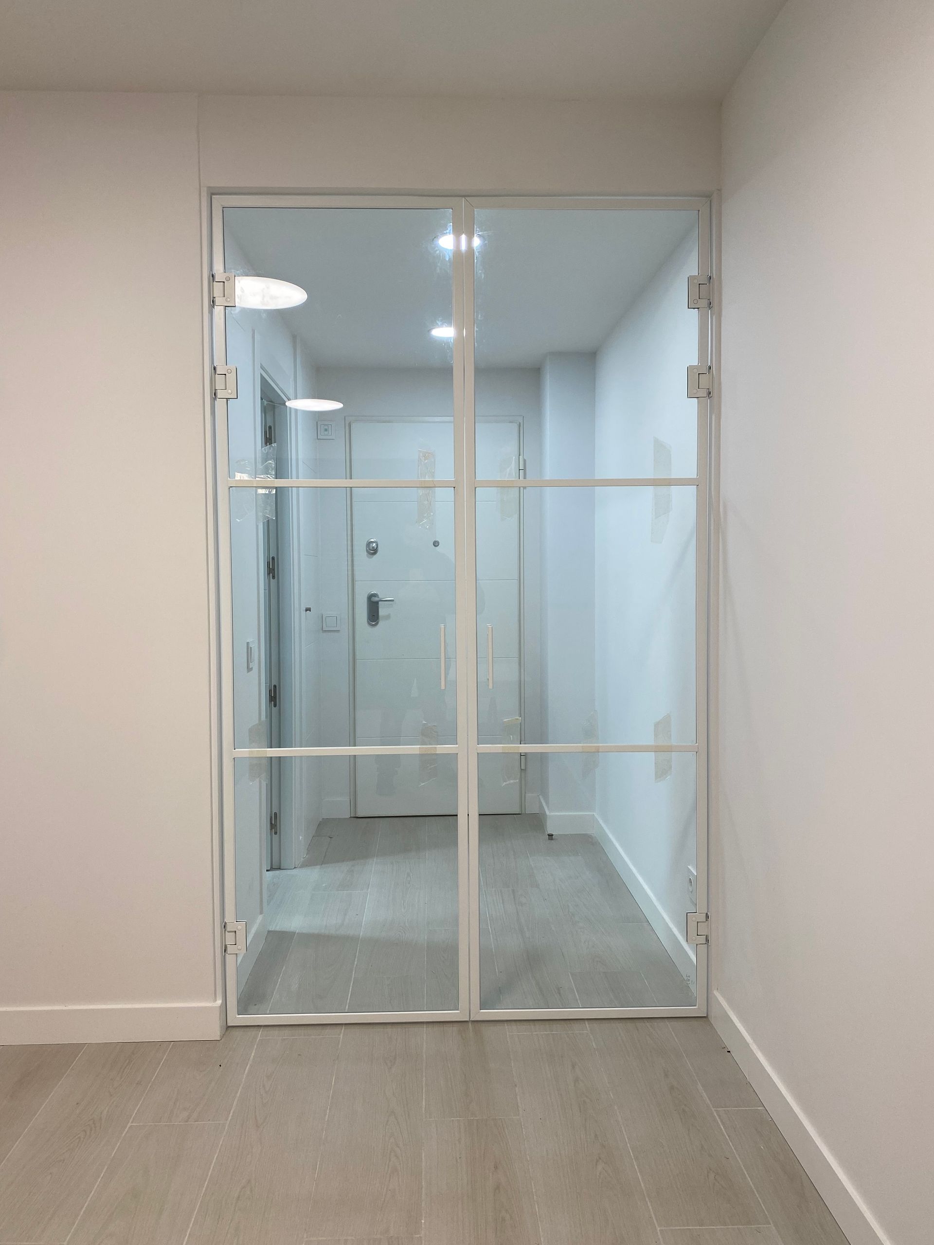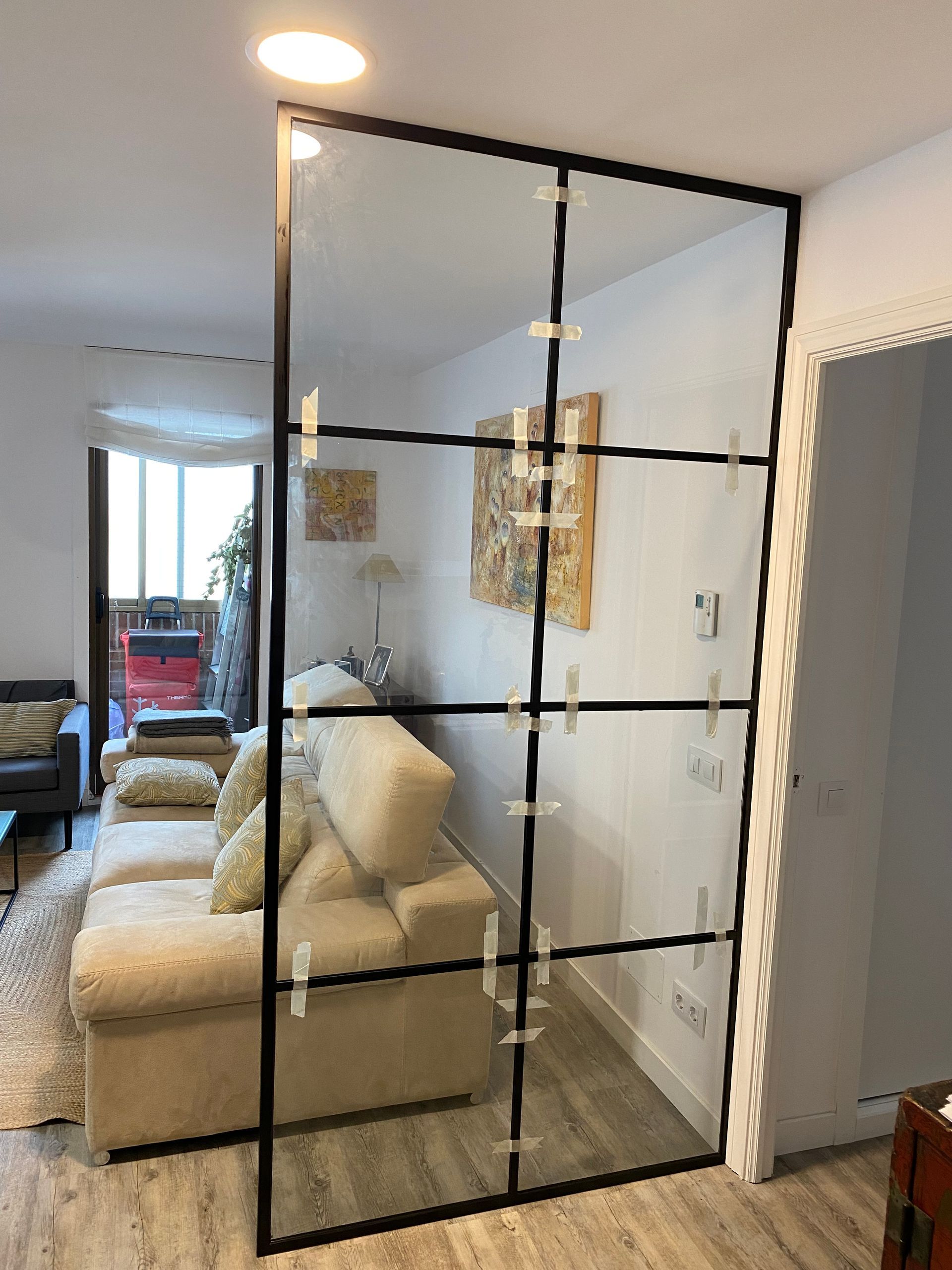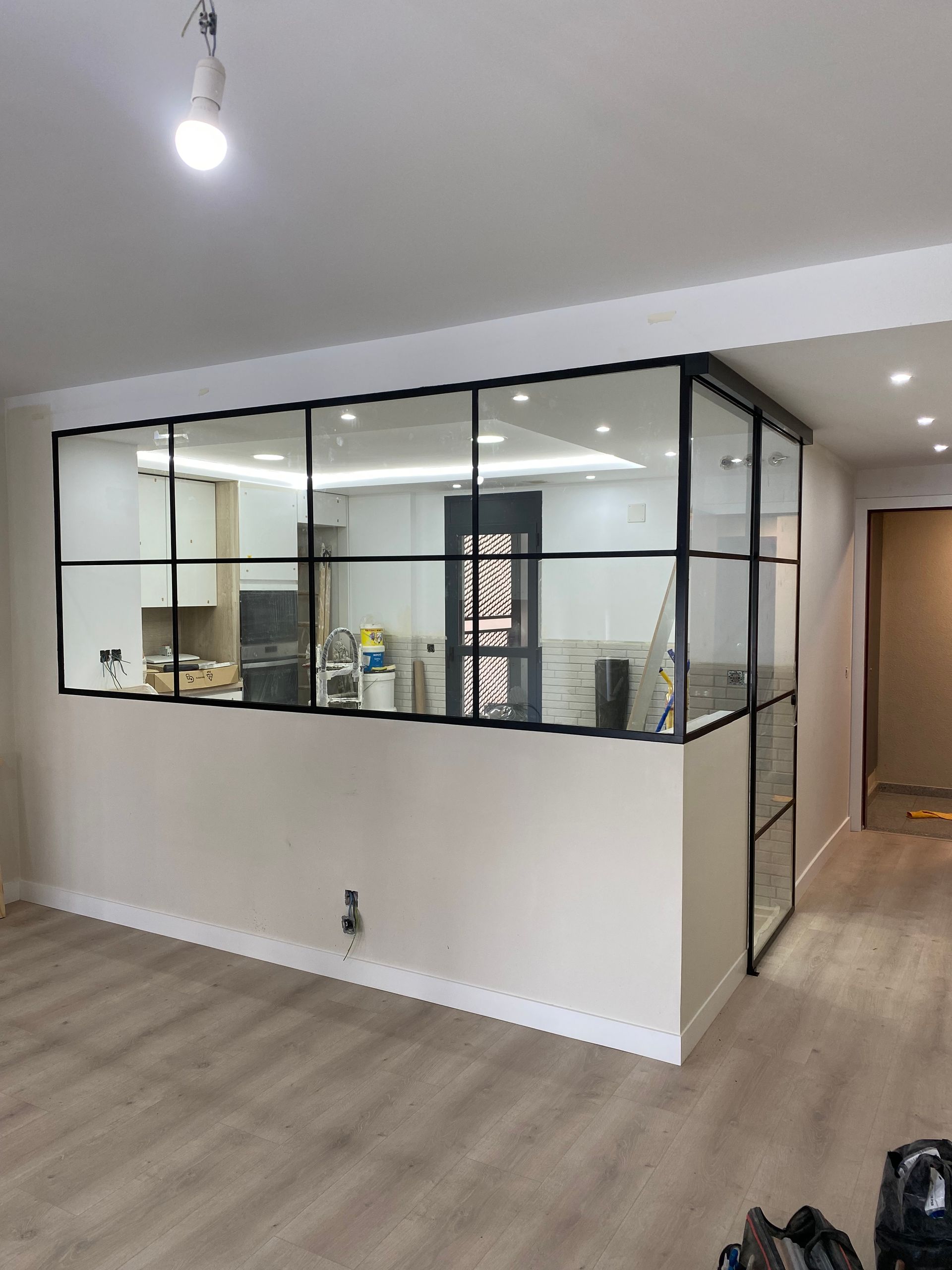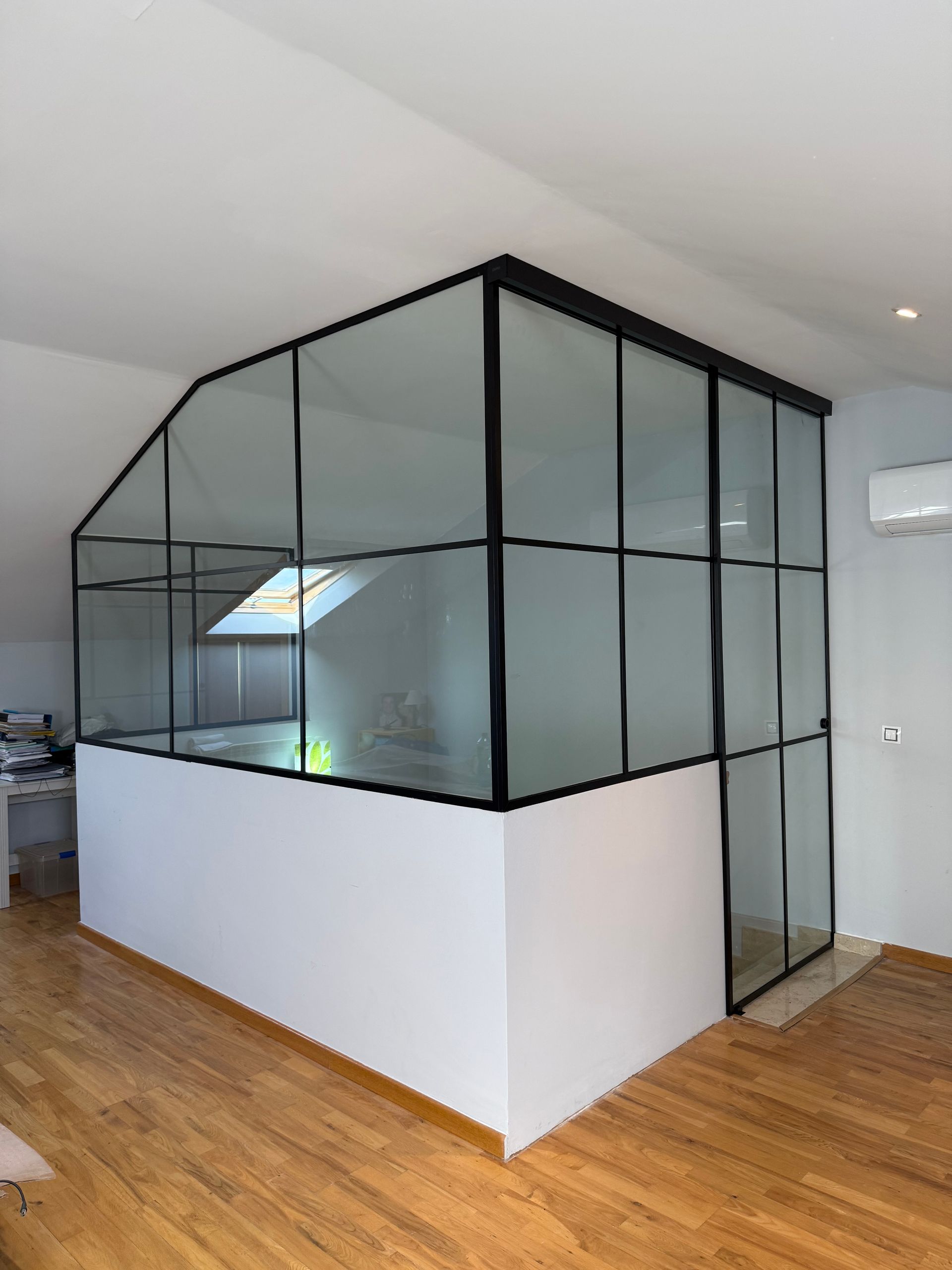 Mamparas estilo vintage, tambien llamadas estilo industrial, realizadas a medida con vidrios laminares de seguridad y perfilería en aluminio lacado. Color a elegir, consiguiendo un efecto similar a las estruturas de hierro, pero con menos grosor en los marcos y quedando muy agradables a nivel decorativo y pudiendo aplicar el sistema, igualmente, a mamparas de ducha, ya que no se oxidan.