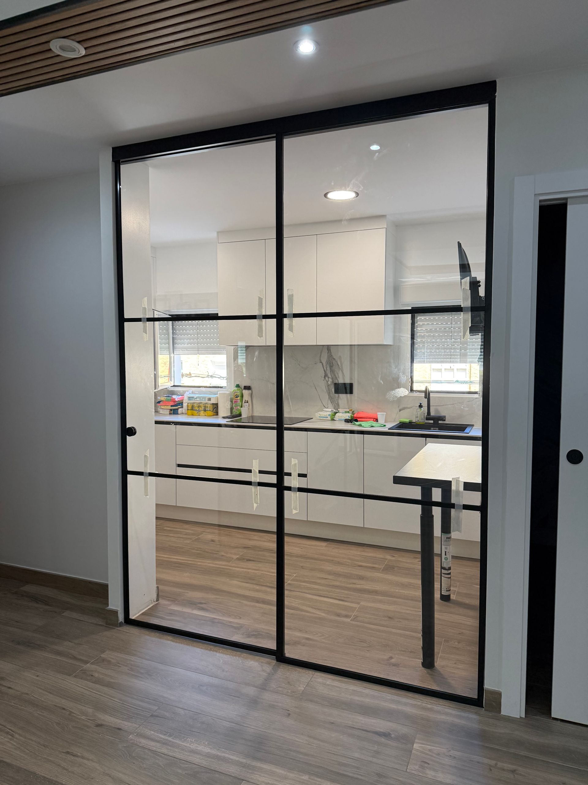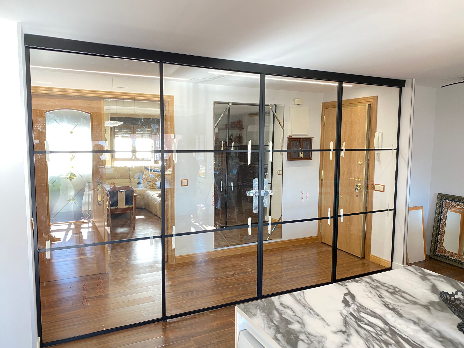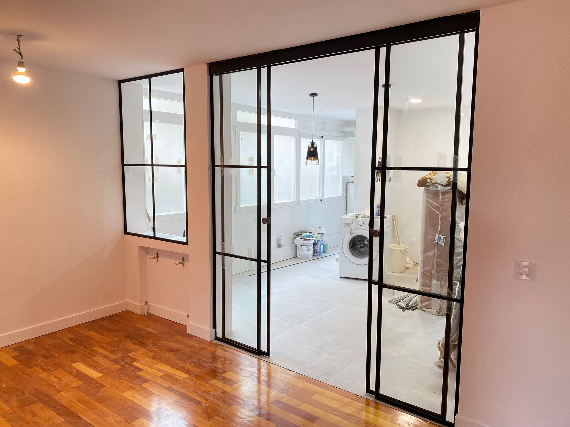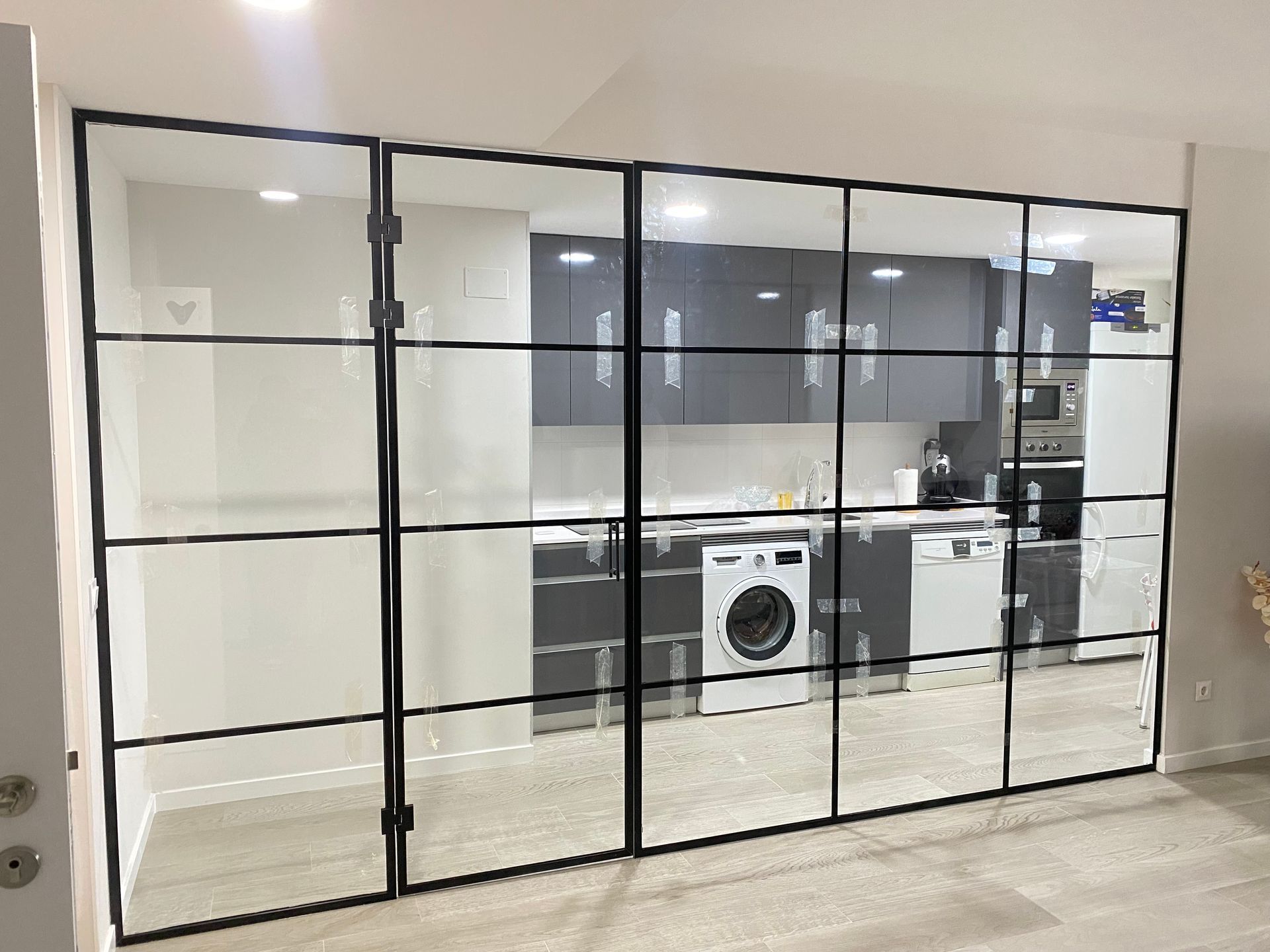 Mamparas estilo vintage, tambien llamadas estilo industrial, realizadas a medida con vidrios laminares de seguridad y perfilería en aluminio lacado. Color a elegir, consiguiendo un efecto similar a las estruturas de hierro, pero con menos grosor en los marcos y quedando muy agradables a nivel decorativo y pudiendo aplicar el sistema, igualmente, a mamparas de ducha, ya que no se oxidan.