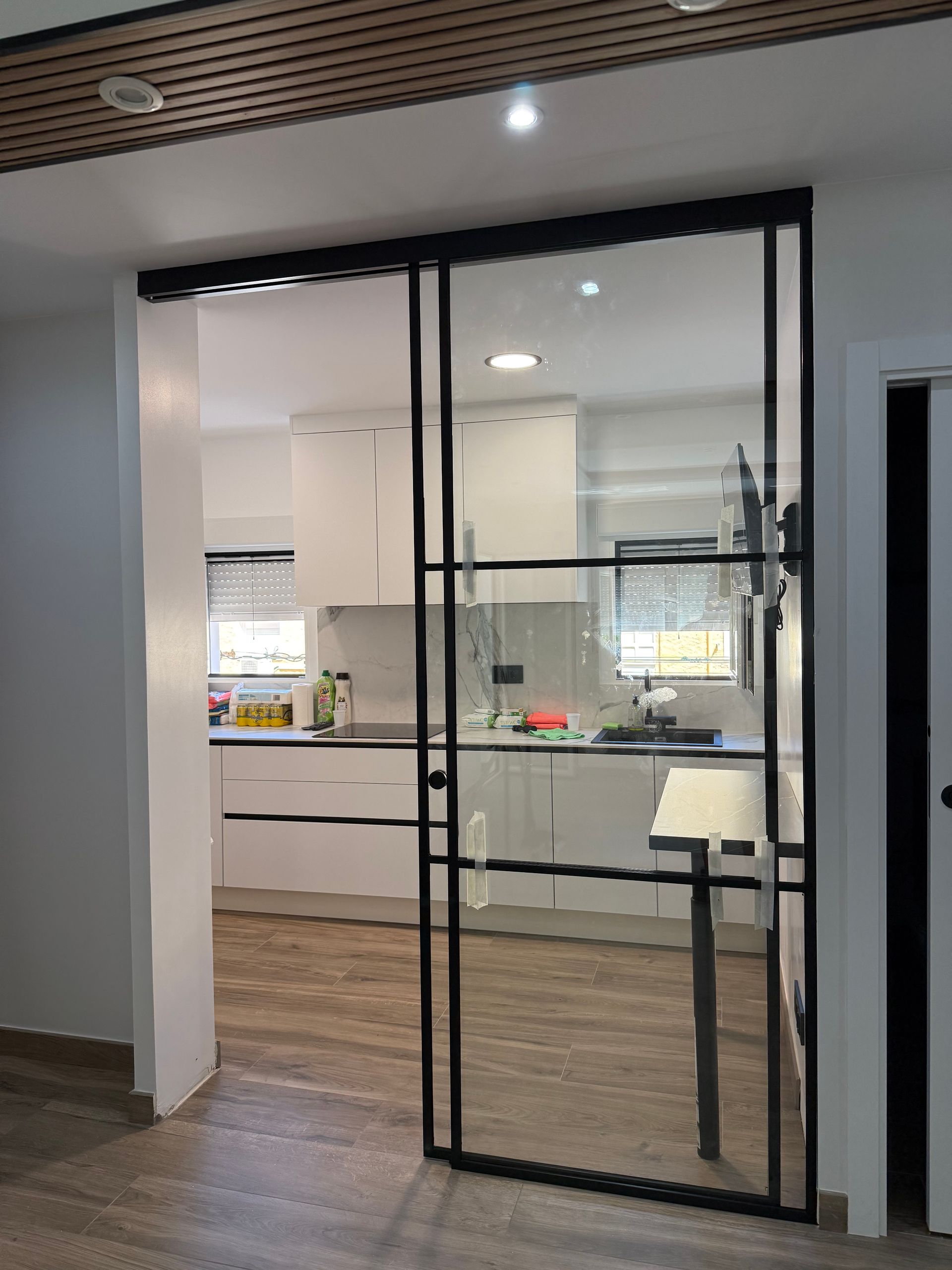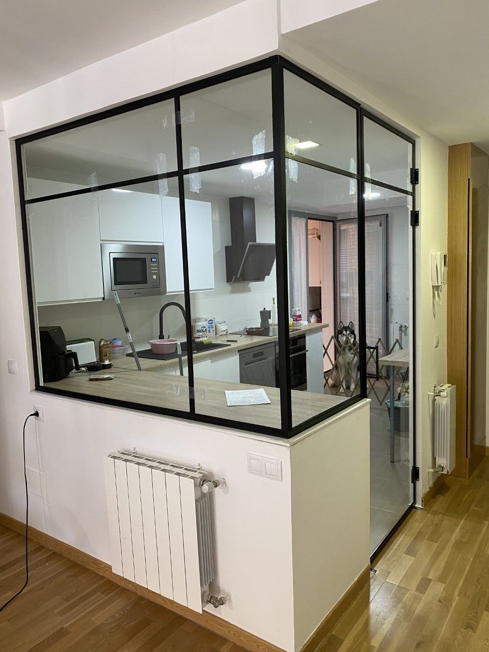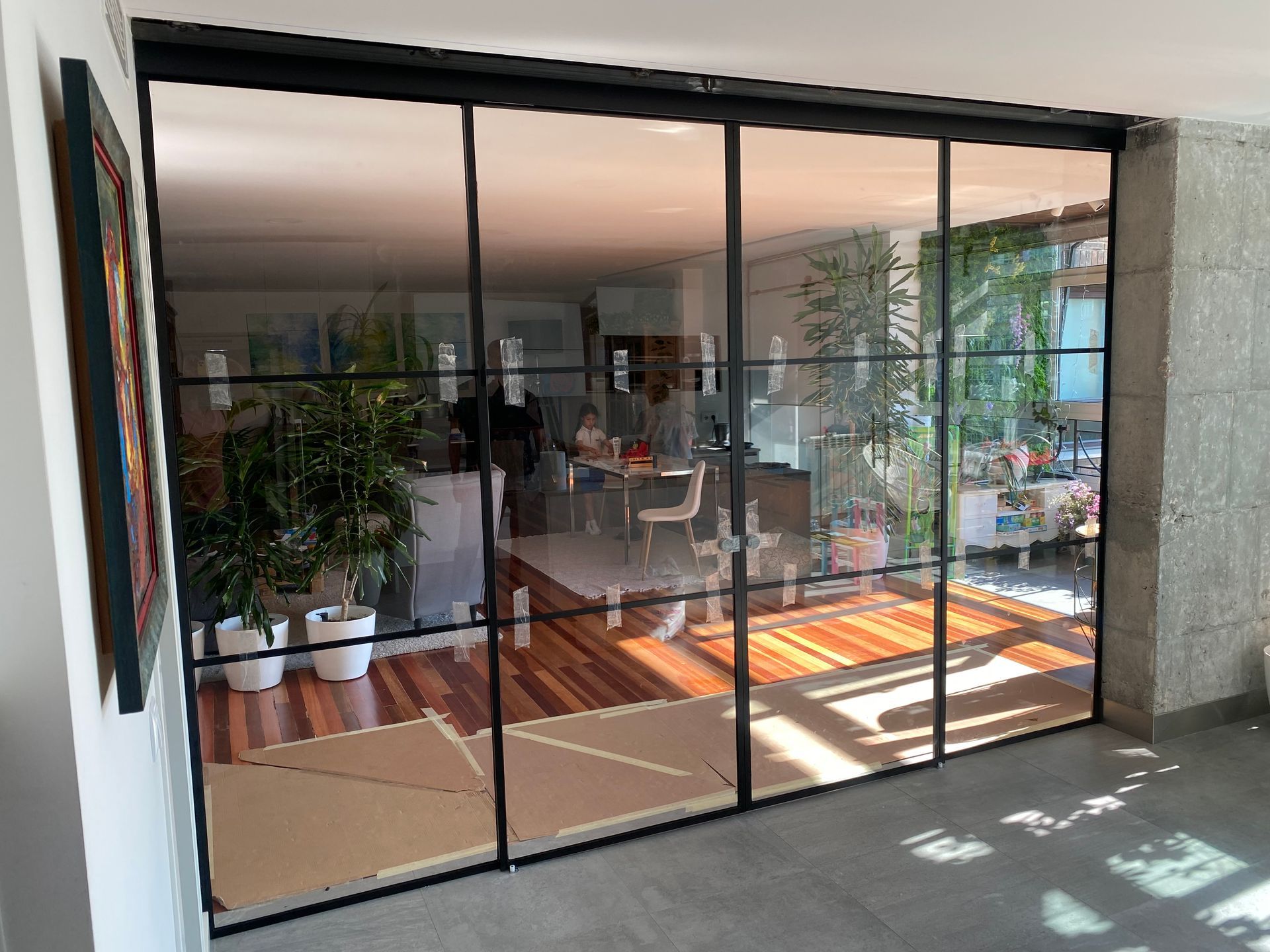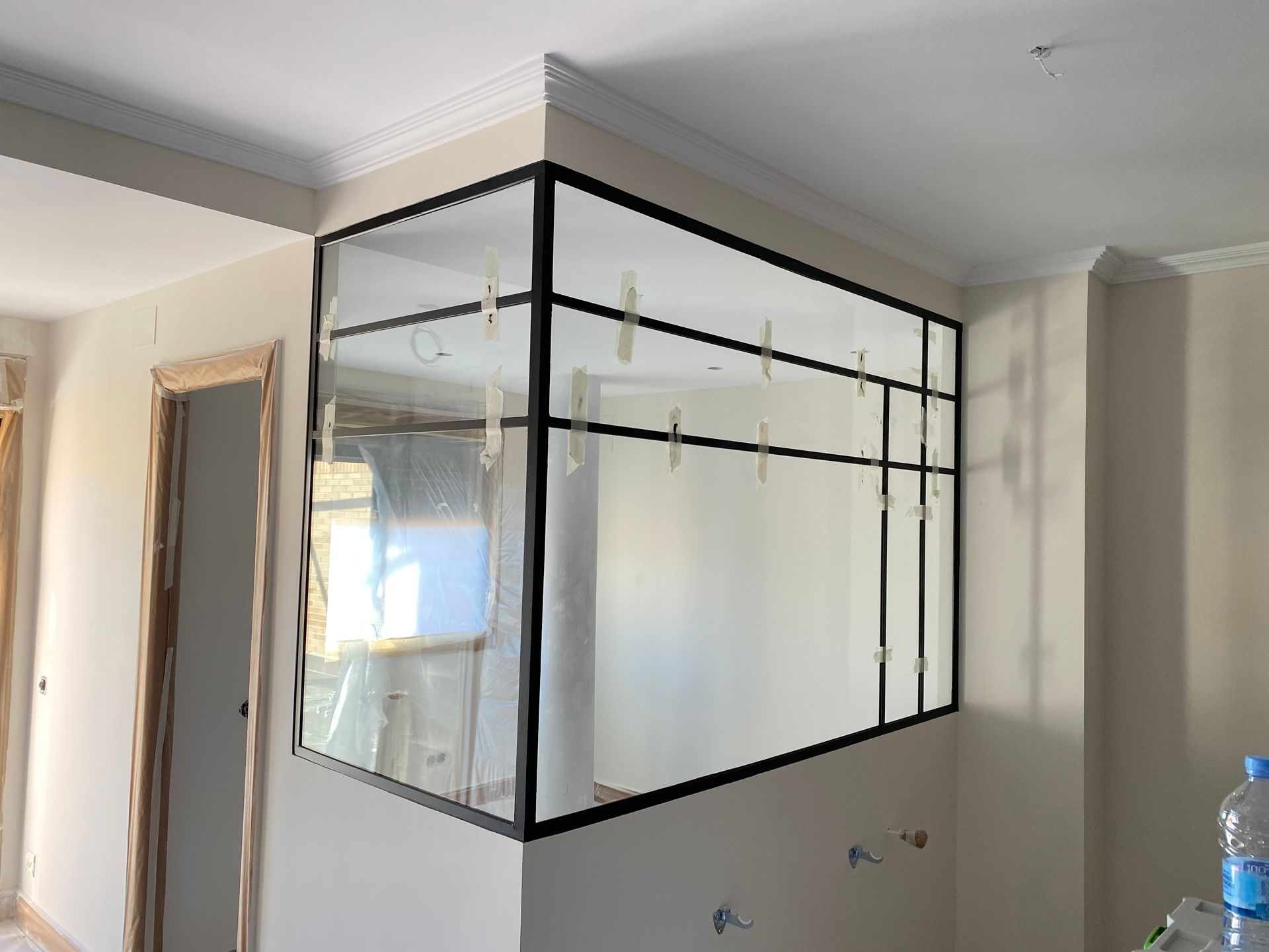 Mamparas estilo vintage, tambien llamadas estilo industrial, realizadas a medida con vidrios laminares de seguridad y perfilería en aluminio lacado. Color a elegir, consiguiendo un efecto similar a las estruturas de hierro, pero con menos grosor en los marcos y quedando muy agradables a nivel decorativo y pudiendo aplicar el sistema, igualmente, a mamparas de ducha, ya que no se oxidan.