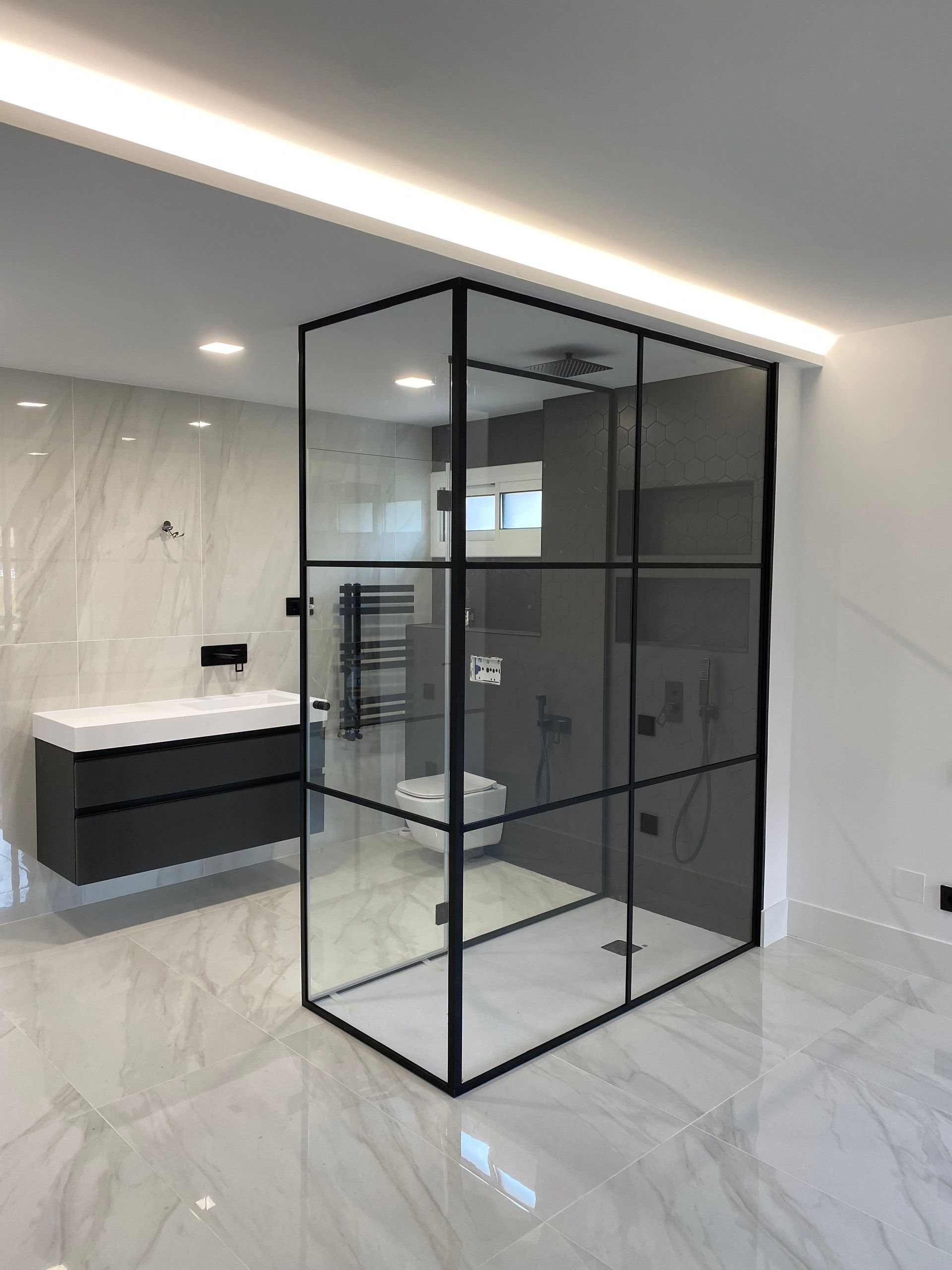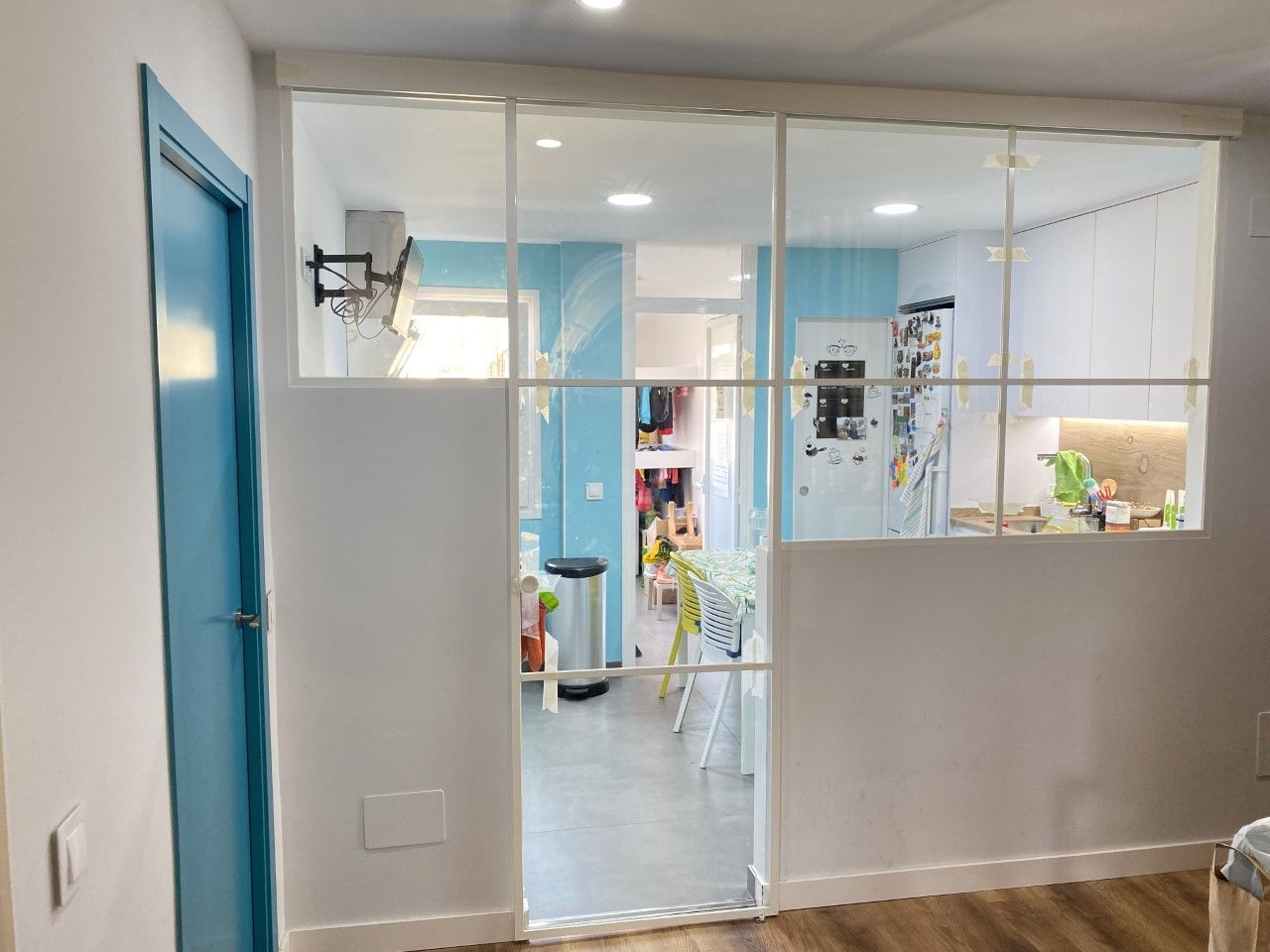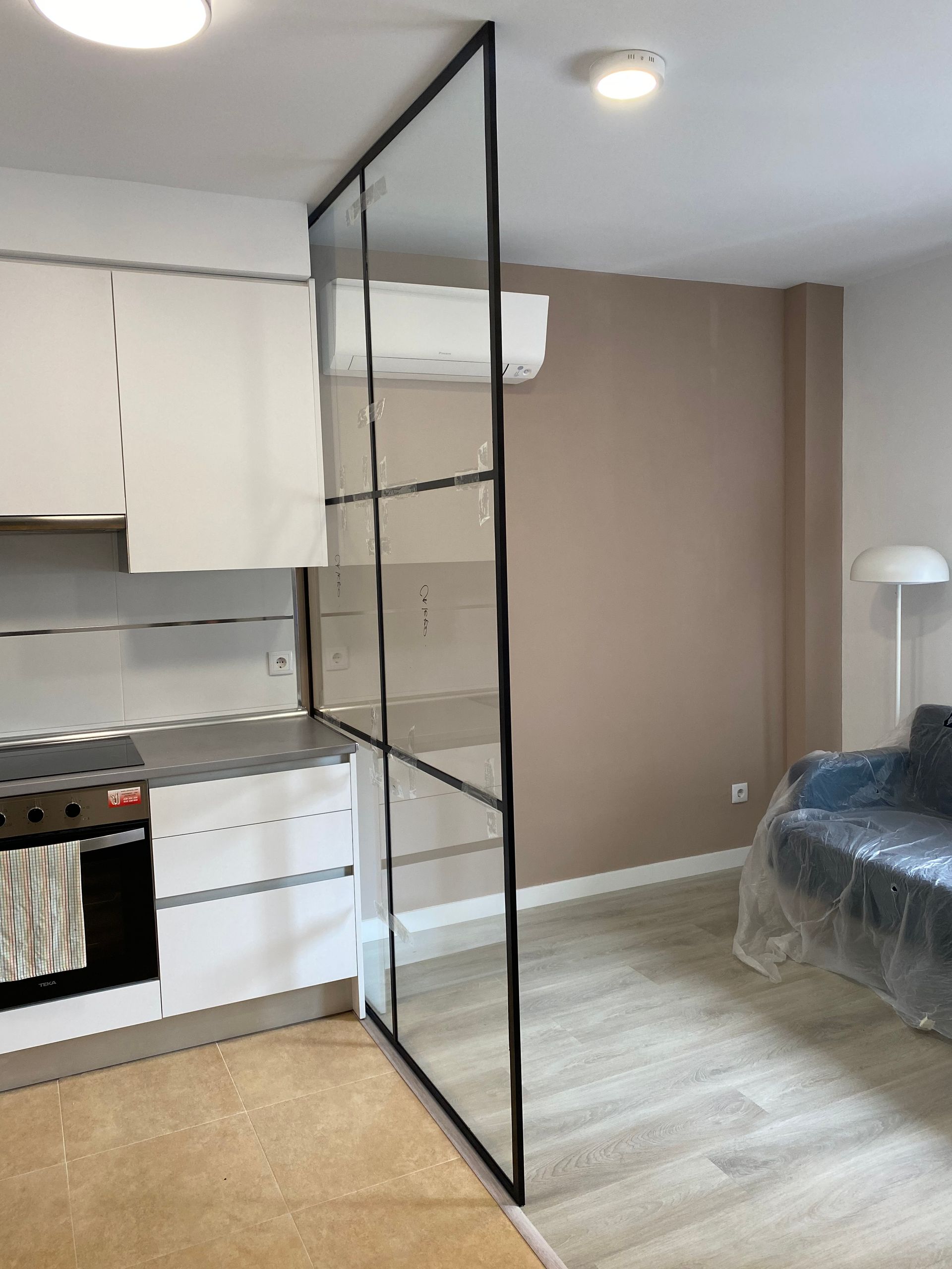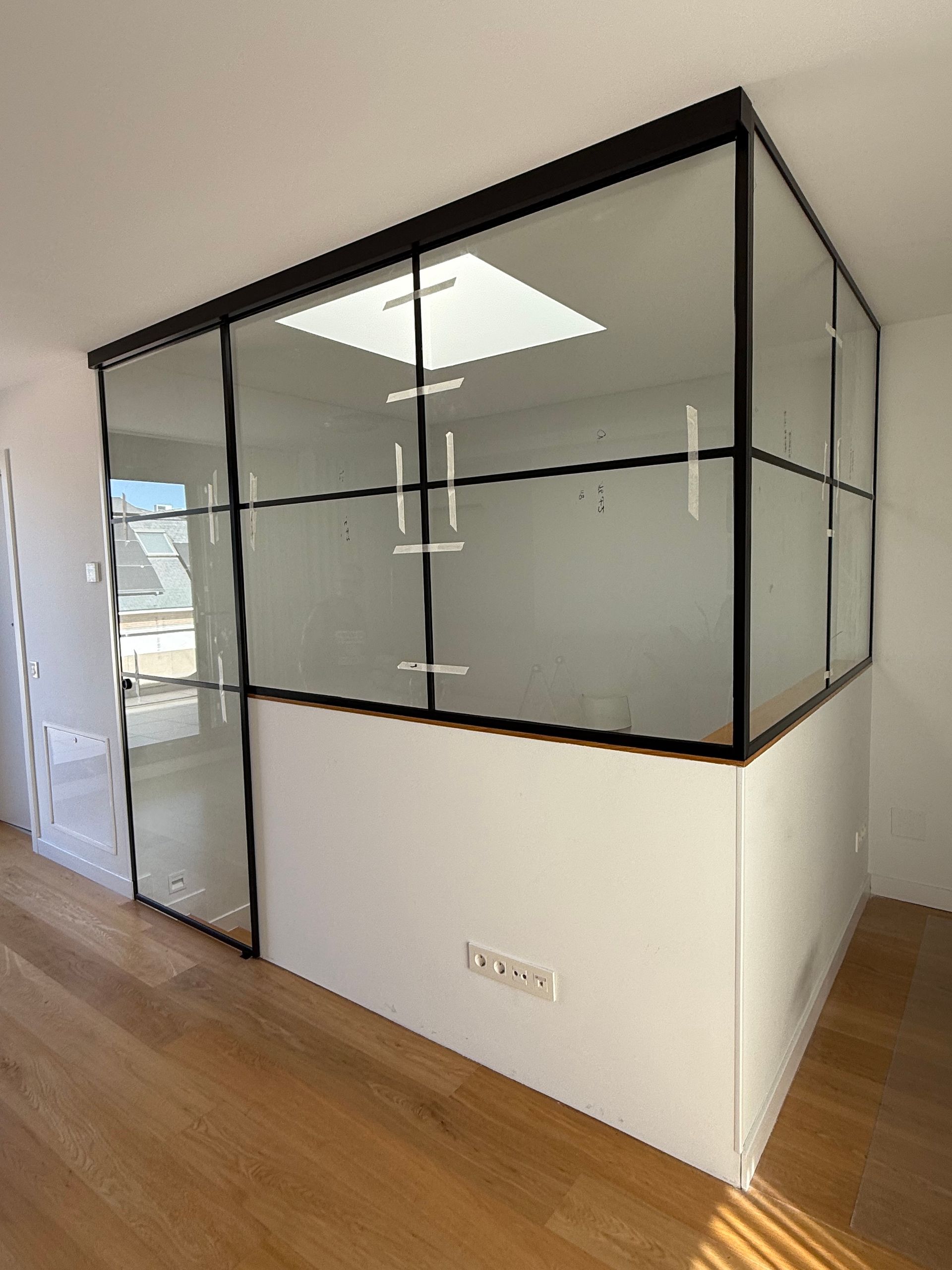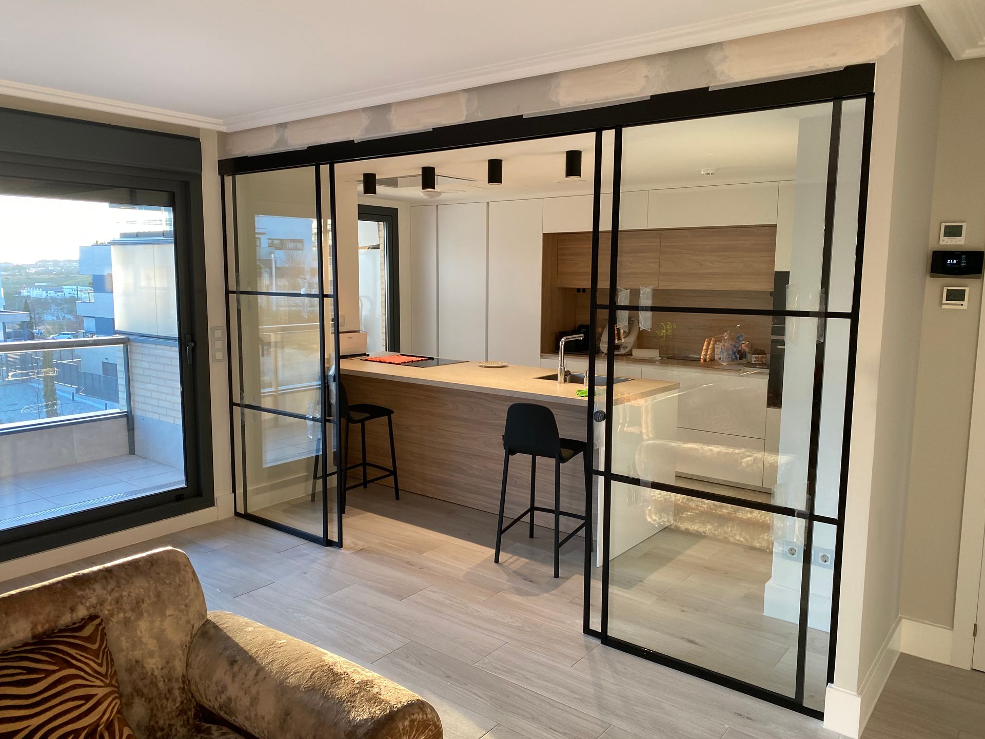 Mamparas estilo vintage, tambien llamadas estilo industrial, realizadas a medida con vidrios laminares de seguridad y perfilería en aluminio lacado. Color a elegir, consiguiendo un efecto similar a las estruturas de hierro, pero con menos grosor en los marcos y quedando muy agradables a nivel decorativo y pudiendo aplicar el sistema, igualmente, a mamparas de ducha, ya que no se oxidan.
